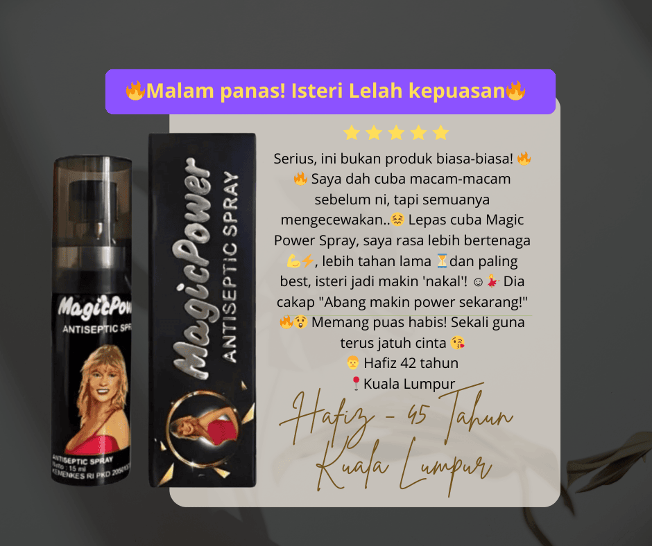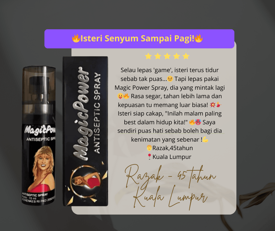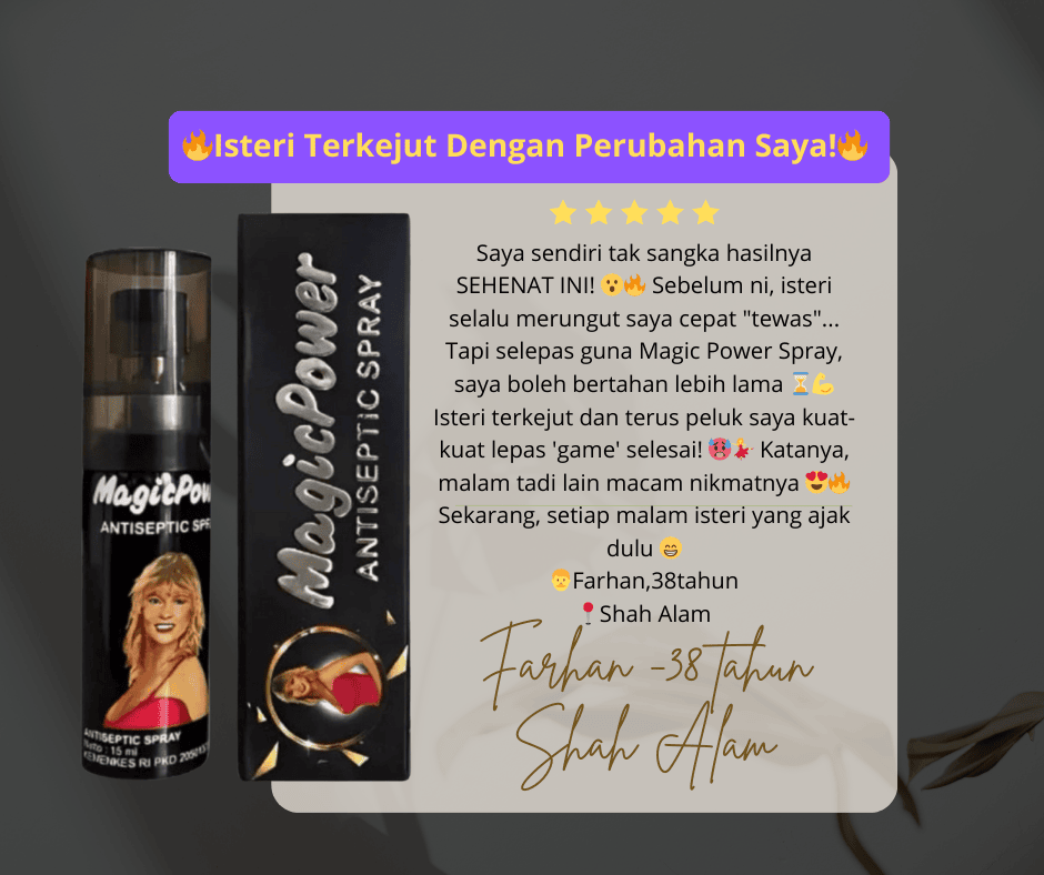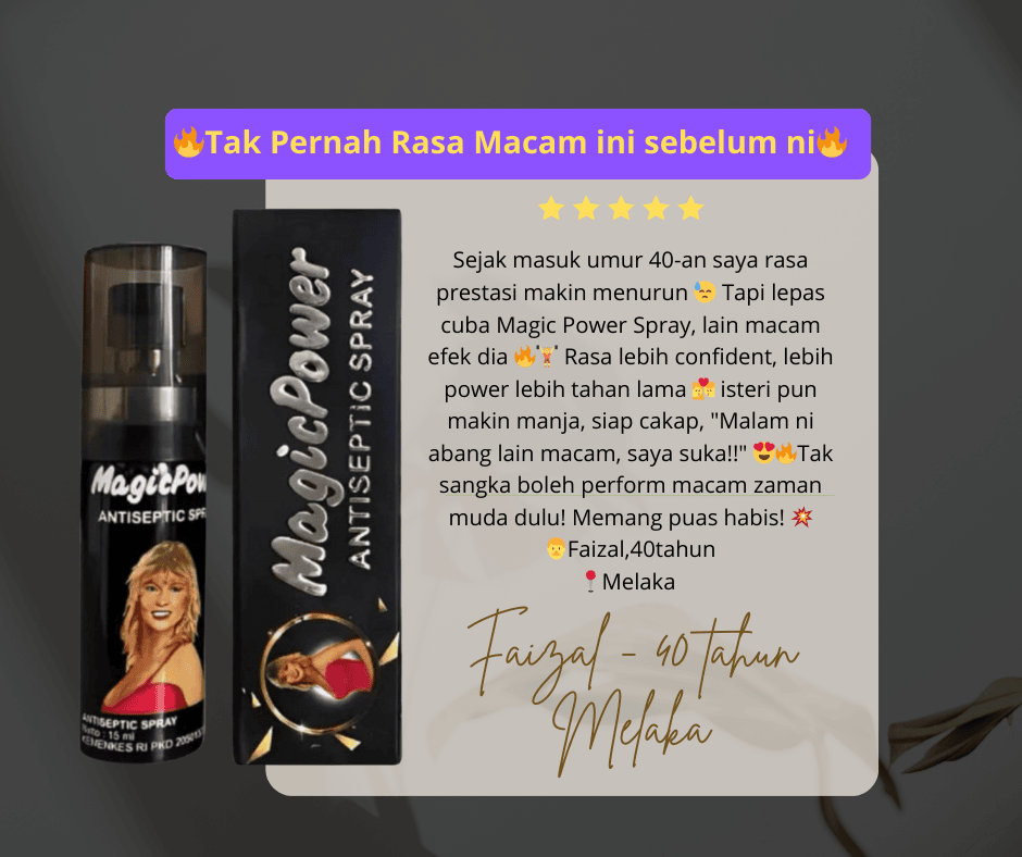 Kami faham, anda dah pun cuba dengan pelbagai cara untuk tingkatkan gametime untuk atasi masalah premature ejaculation ni dengan beli macam-macam ubat urut, krim, makan pil dan guna pelbagai alat-alat diluar sana. Kerana Itu kami syorkan  Magic Power Spray.
